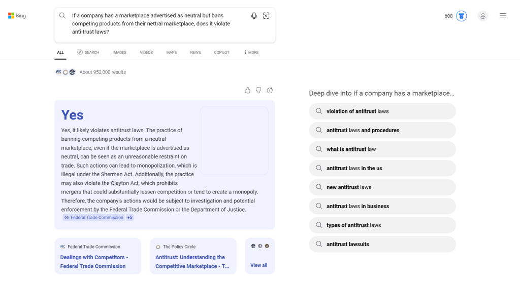 We asked the AI on Bing if Roblox’s behavior likely violates the anti-trust laws. It believes so.